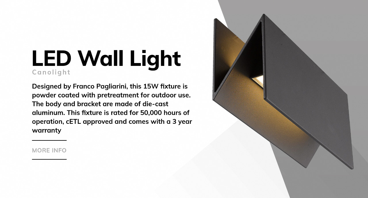 Designed by Franco Pagliarini, this 15W fixture is powder coated with pretreatment for outdoor use. The body and bracket are made of die-cast aluminum. This fixture is rated for 50,000 hours of operation, cETL approved and comes with a 3 year warranty